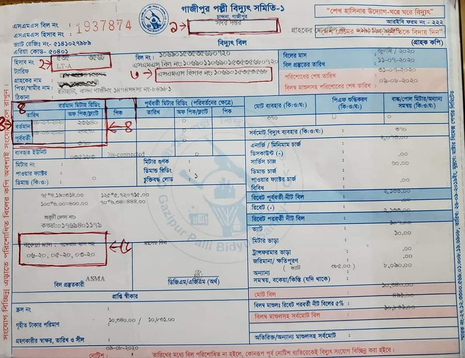 ১। ১ নং ছবিতে ১নং মার্ক করা যায়গায় গ্রাহক কোন অফিসের আওতায় সেটা লেখা থাকে।সাধারনত সদর দপ্তর,জোনাল,সাব-জোনাল অফিসে বিভাজন করে সেবা দেওয়া হয়।